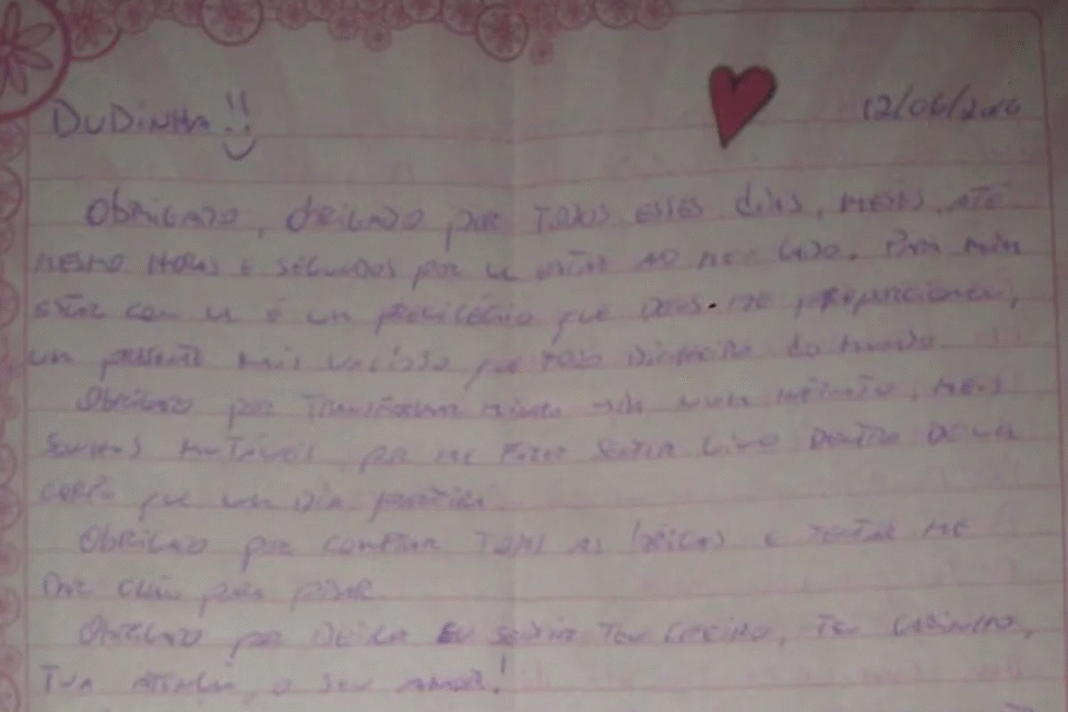 Leia a carta de amor escrita por Cristian Cravinhos para Duda: