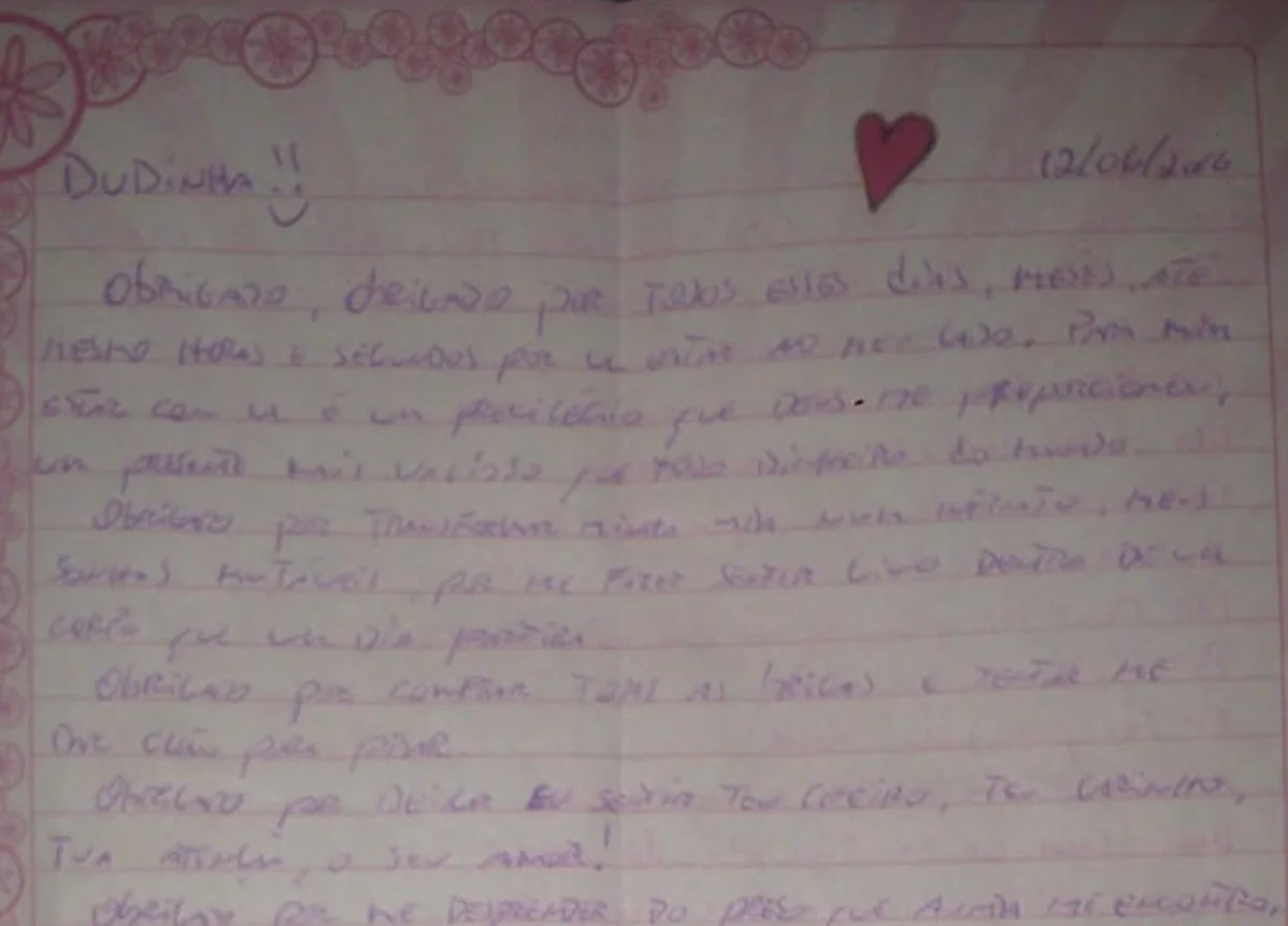 No texto, o criminoso se dirige a “Dudinha”, agradecendo o carinho e a parceria durante o período em que ficaram juntos na prisão.