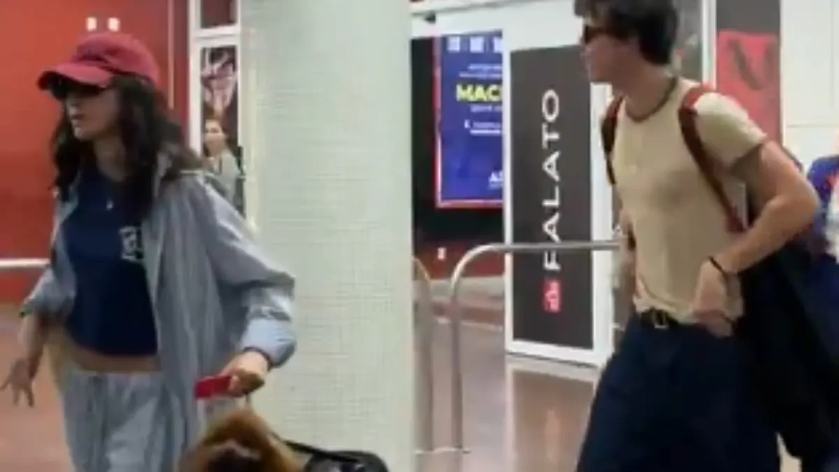 Vídeos publicados nas redes sociais mostram Shawn Mendes atendendo fãs no saguão do aeroporto, enquanto Bruna Marquezine segue à frente, carregando uma mala.