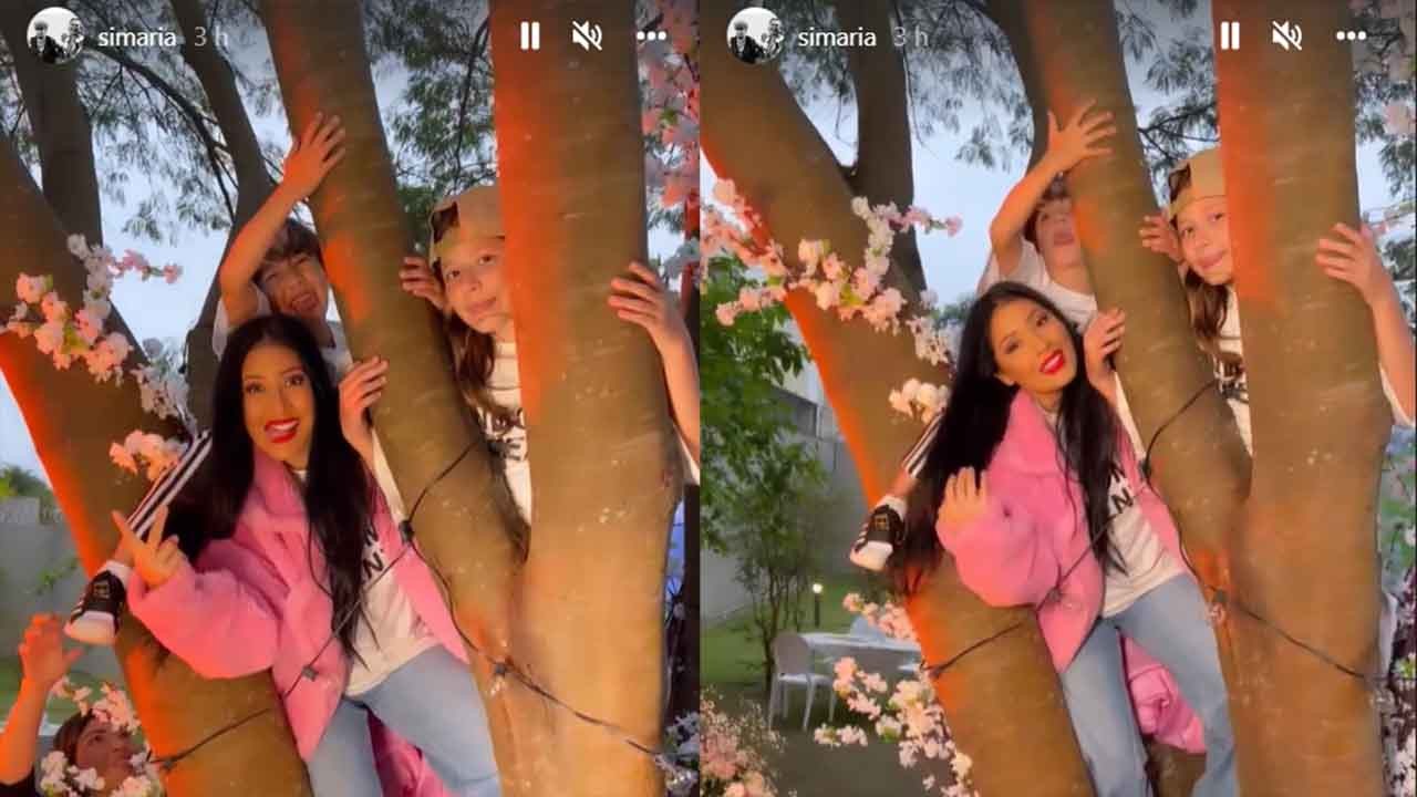 Nesta sexta-feira (19), horas após o anúncio oficial de separação de sua dupla sertaneja, Simone Mendes, Simaria apareceu em vídeo com os filhos Giovanna, de 10 anos, e Pawel, de 6, frutos de sua relação com Vicente Escrig. Nas imagens, a cantora surge em clima de descontração e brincadeira com os herdeiros em cima de uma árvore, em uma área externa de uma residência.