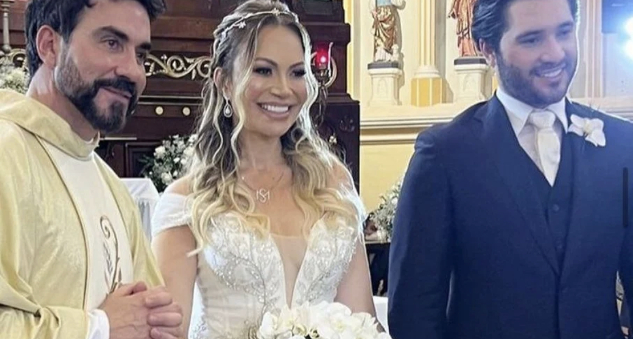 A cantora Solange Almeida, 47, subiu ao altar com o noivo, Monilton Moura, 31, em cerimônia que contou com amigos e famosos em Fortaleza (CE). A parte religiosa foi celebrada pelo padre Fábio de Melo.