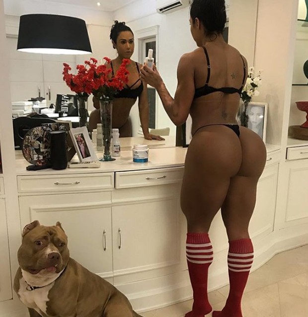 Gracyanne Barbosa tem 111 centímetros de glúteos (2 cm a mais que Kim Kardashian, como bem lembrou o The Sun) e suas ‘belfies’ já fazem sucesso entre os brasileiros. Muitas delas, aliás, viram memes na internet, como a foto abaixo, que chamou atenção tanto pelo bumbum da modelo quanto pela expressão de seu cachorro de estimação.