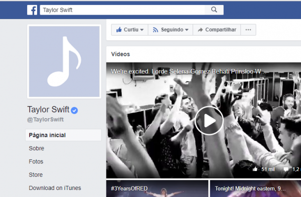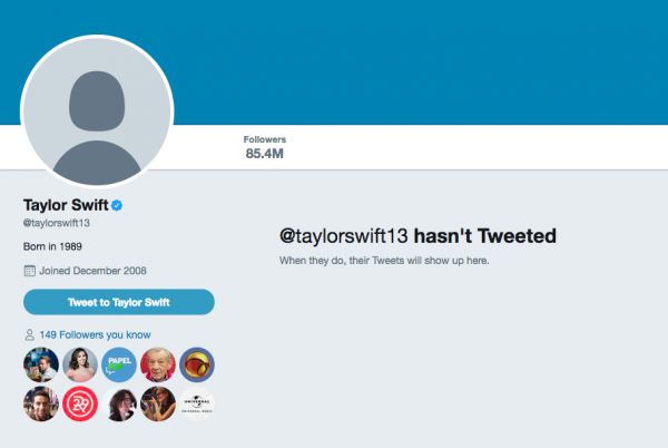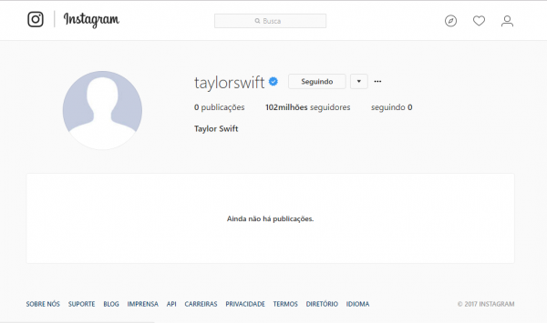 No início da tarde desta sexta-feira (18) todas as fotos das redes sociais da cantora Taylor Swift foram apagados. Não há mais nenhum tweet e nenhuma foto no Instagram. Alguns conteúdos seguem no Facebook, mas sem nenhuma fotografia.