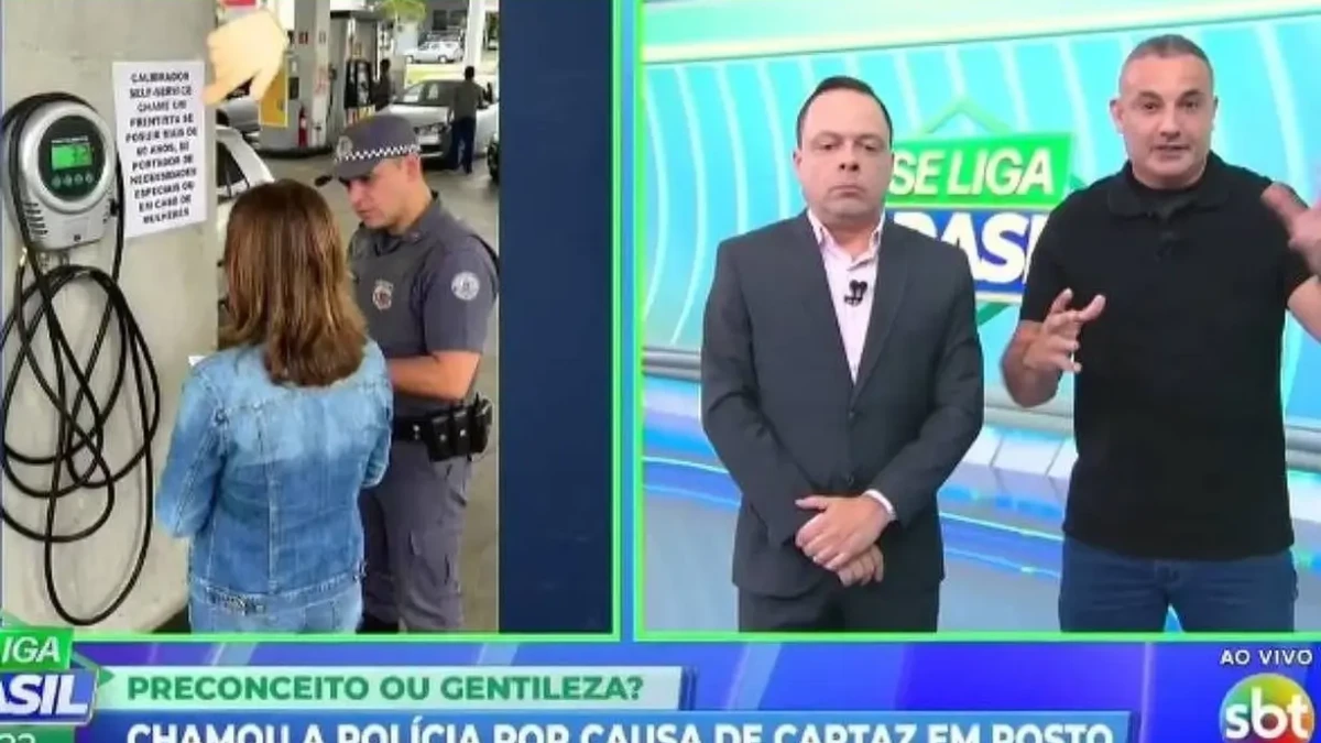 O apresentador Thiago Gardinali e o comentarista Delegado Palumbo, ao vivo, repercutiram um suposto caso de misoginia num posto de gasolina, que teria colocado na parede um cartaz com a informação de que idosos e mulheres precisariam de ajuda para calibrar os pneus.