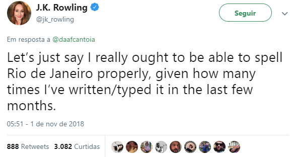 Não demorou para que os fãs brasileiros bombardeassem a escritora com perguntas. Uma delas questionou se Rowling está preparando uma surpresa. A autora deu uma resposta que animou o público: “Vamos dizer que eu deveria soletrar Rio de Janeiro de forma correta, considerando quantas vezes escrevi/digitei isso nos últimos meses.”