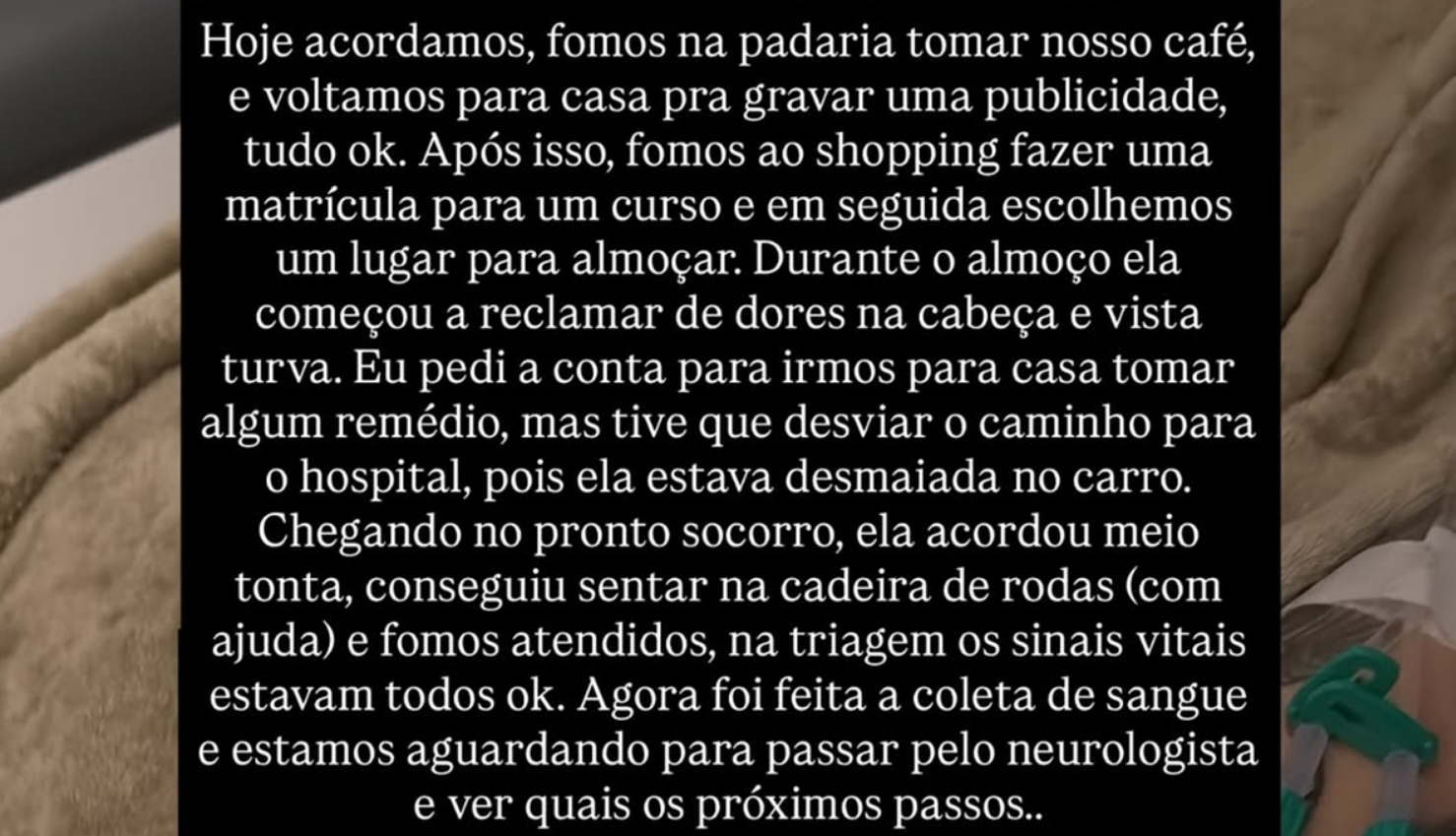 Ao chegar ao pronto-socorro, Thais recobrou a consciência, ainda tonta, e foi encaminhada para atendimento médico de emergência. “Na triagem, os sinais vitais estavam todos ok”, acrescentou o marido. Em uma das publicações, ele mostrou uma foto da esposa deitada em uma maca com a legenda: “Simplesmente do nada!”.