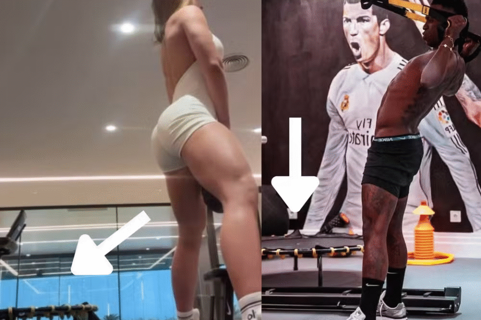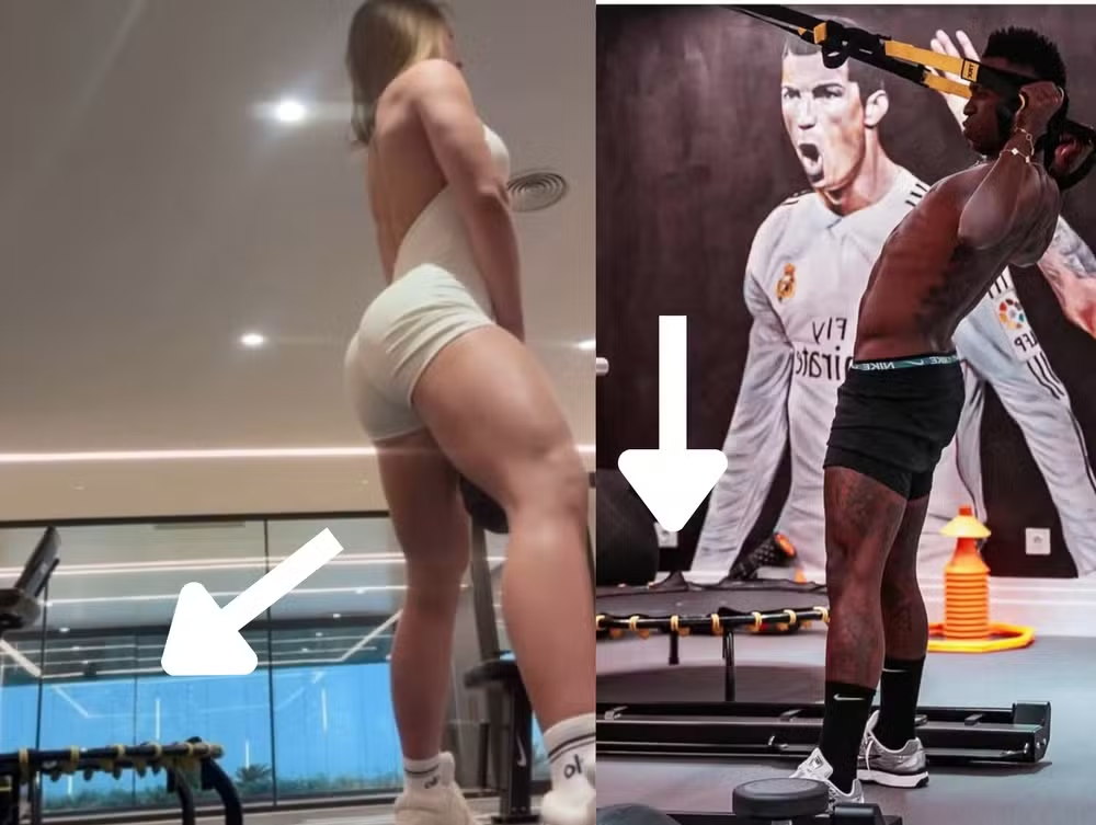 Nos registros, o que chamou atenção foi o ambiente: piso azulado, aparelhos específicos e iluminação de LED idênticos aos que aparecem em imagens da mansão de Vini Jr. Além disso, um aparelho de jump, também igual ao do jogador, foi visto nos stories.