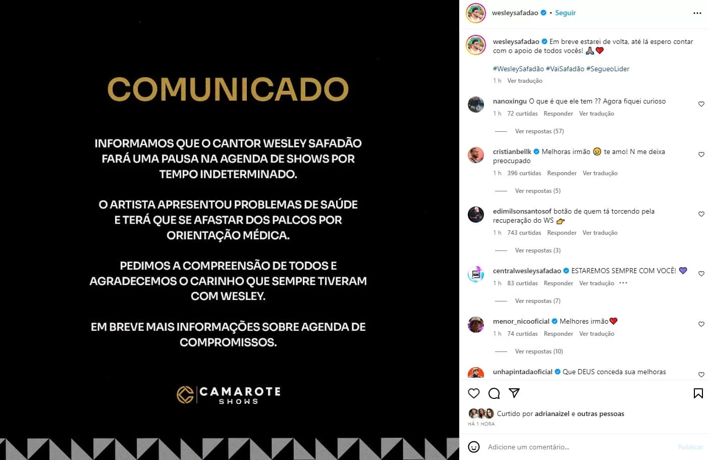 “Informamos que o cantor Wesley Safadão fará uma pausa na agenda de shows por tempo indeterminado. O artista apresentou problemas de saúde e terá que se afastar dos palcos por orientação médica”, diz o comunicado publicado no perfil do artista no Instagram.