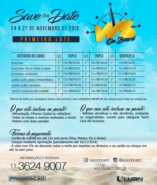 Vale ressaltar que o primeiro lote de ingressos do WS On Board já está esgotado. A compra de bilhetes pode ser feita neste site.