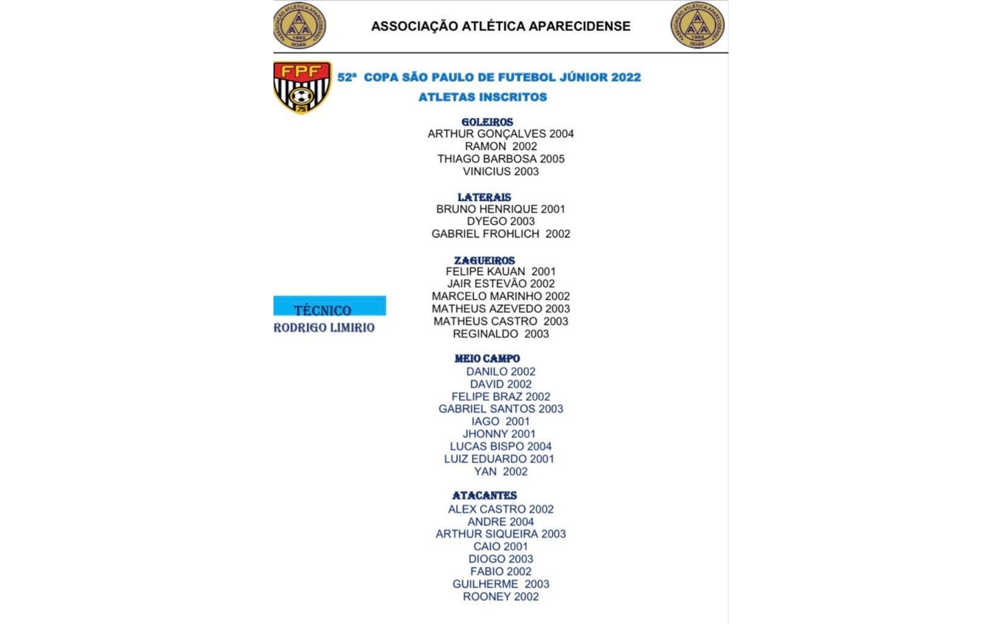 Aparecidense divulga lista de inscritos para a Copa São Paulo de 2022