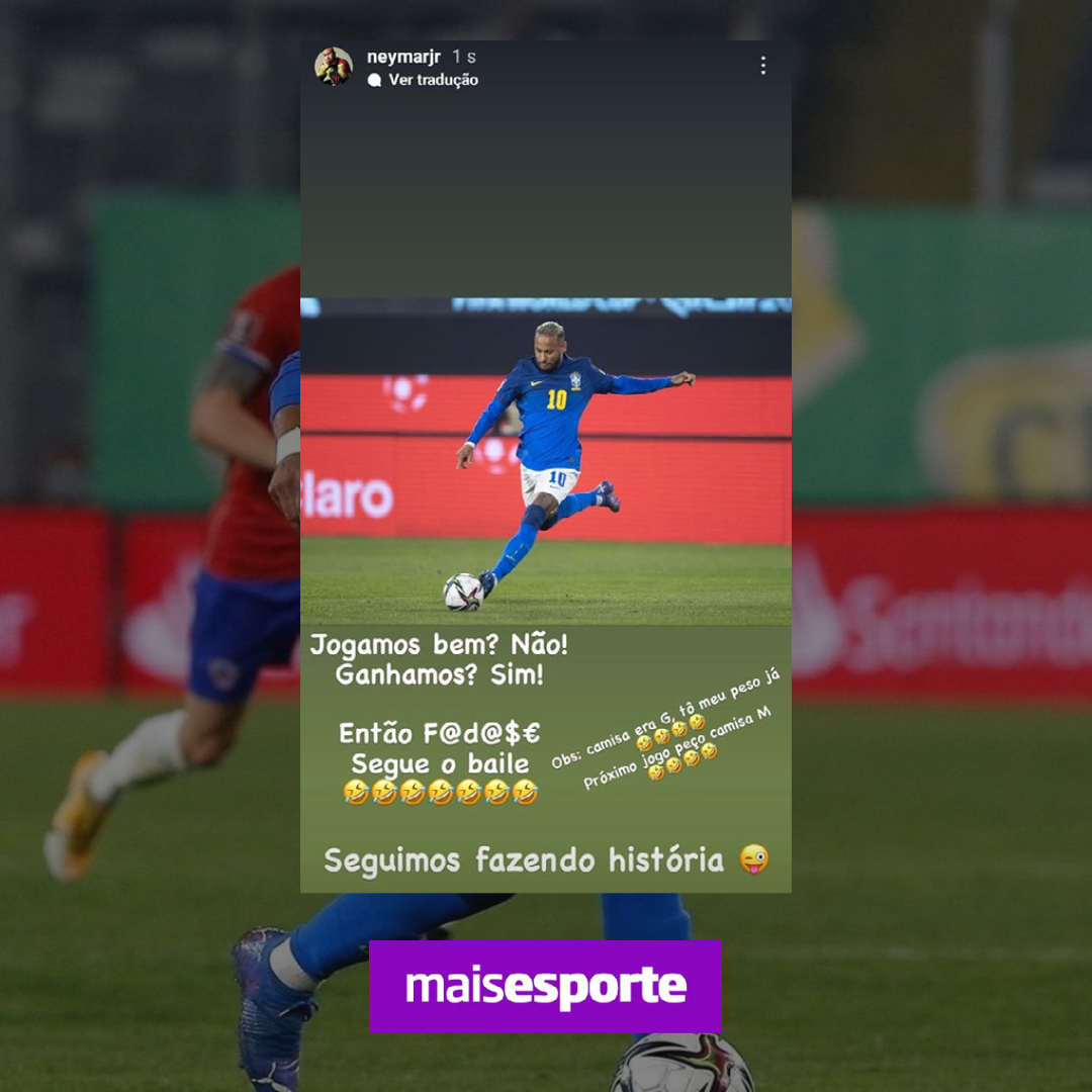 Também pelas redes sociais, Neymar reconheceu que a seleção jogou mal em Santiago, apesar do triunfo. “Jogamos bem? Não! Ganhamos? Sim! Então f… Segue o baile. Seguimos fazendo história”, afirmou, usando um palavrão para comentar a partida.