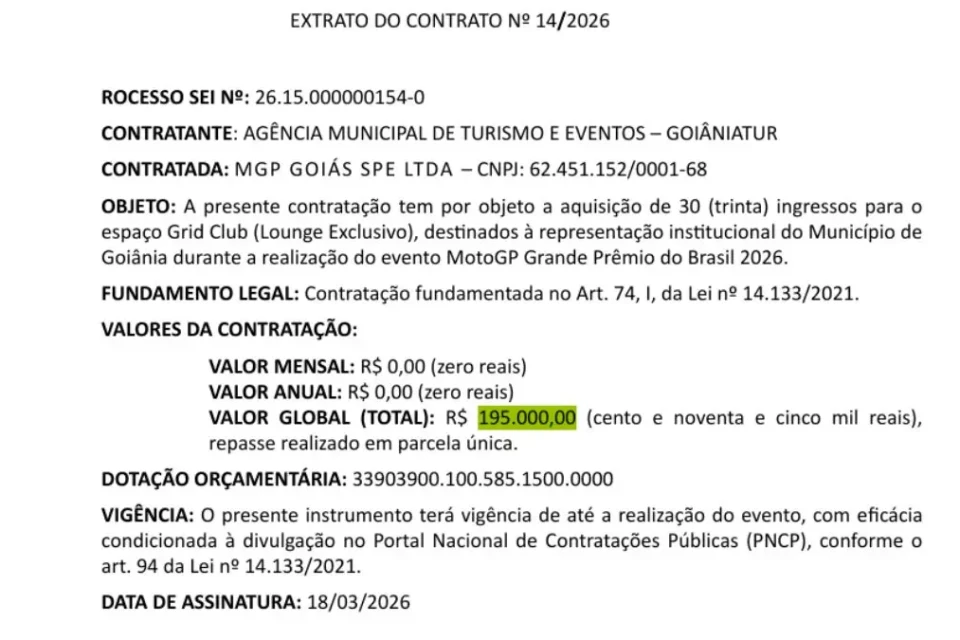 A Prefeitura de Goiânia gastou R$ 195 mil com a compra de 30 ingressos VIP para o espaço exclusivo do MotoGP, que ocorre entre esta sexta (20/3) e domingo (22/3), na capital. O valor, conforme documento assinado na última quinta-feira (18/3), deve ser pago em parcela única.