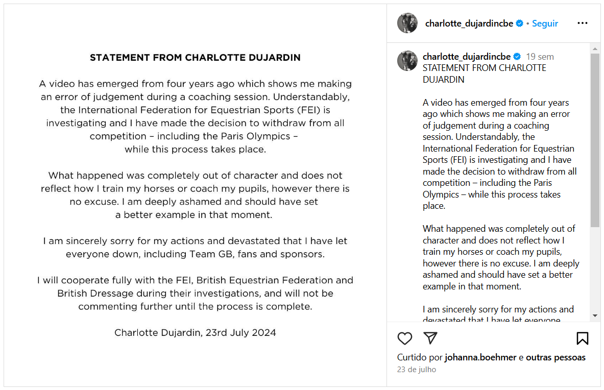 Dujardin já havia divulgado um pedido de desculpas e afirmado que isso era “completamente fora do meu normal” e um “erro de julgamento”. Três dias antes da Cerimônia de Abertura de Paris-2024 no Rio Sena, ela anunciou que estava se retirando da competição olímpica.