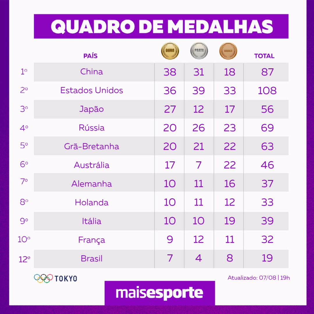 O Brasil ainda tem duas possibilidades de superar esse recorde. Uma delas é a final do boxe feminino com Bia Ferreira contra a irlandesa Kellie Harrington. A outra chance é a final do vôlei feminino com os Estados Unidos. O Time Brasil já colocou 19 medalhas no peito (sete ouros, quatro pratas e oito bronzes).