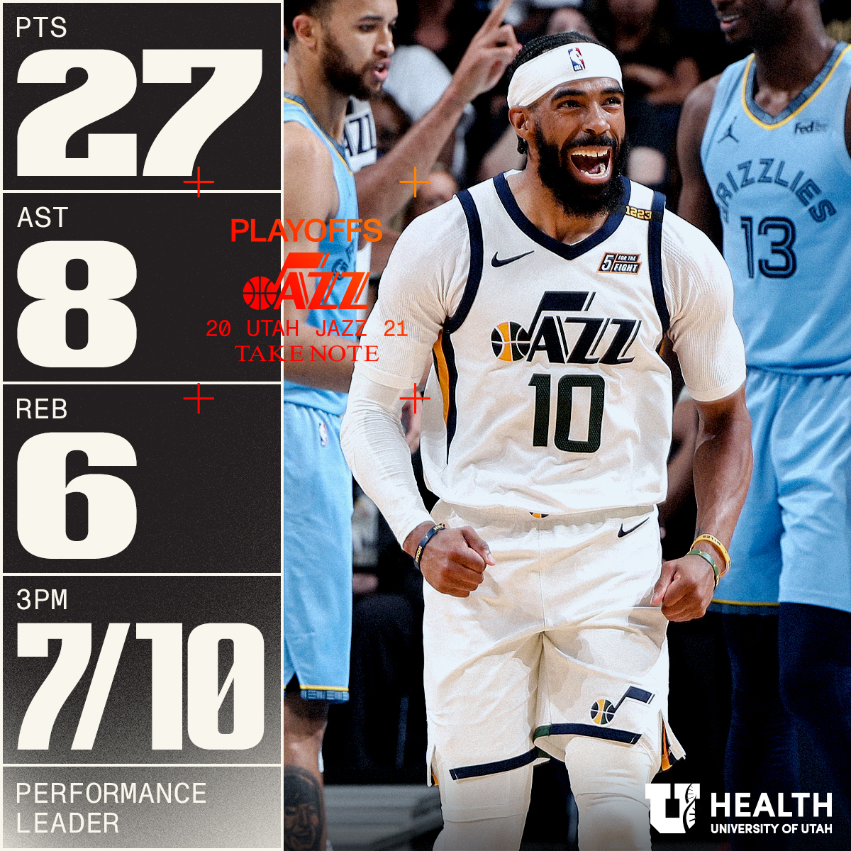 Como tem sido os jogos da série melhor de sete, mais uma vez os Grizzlies ameaçaram superar o dono da melhor campanha da Conferência Oeste. Se na rodada passada o Jazz precisou de 19 bolas de três para ganhar por 12 pontos, a vantagem no jogo 3 só veio por causa de um 16 a 4 nos cinco minutos finais.