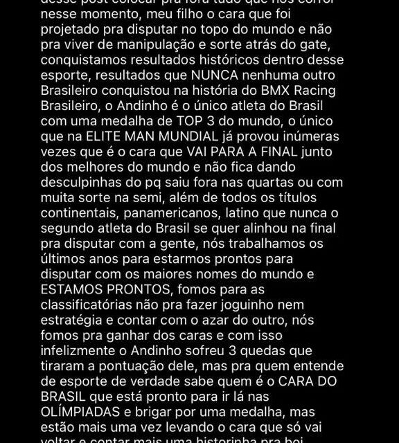 Entre os comentários que mais chamam atenção está o do pai de ‘Andinho’, Anderson Ezequiel, que postou um texto classificado como “Atestado de Indignação” (veja abaixo), citando o fato do seu filho ter conseguido uma medalha no top-3 e criticando os critérios utilizados.