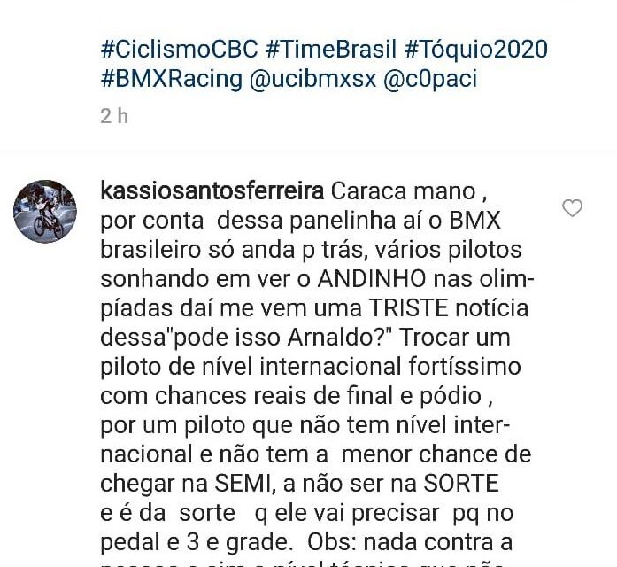 “Com relação a convocação os critérios para os Jogos Olímpicos foram estabelecidos em 2018, conforme publicação em nosso site. As convocações do MTB e BMX já foram realizadas e os convocados já foram confirmados oficialmente”.