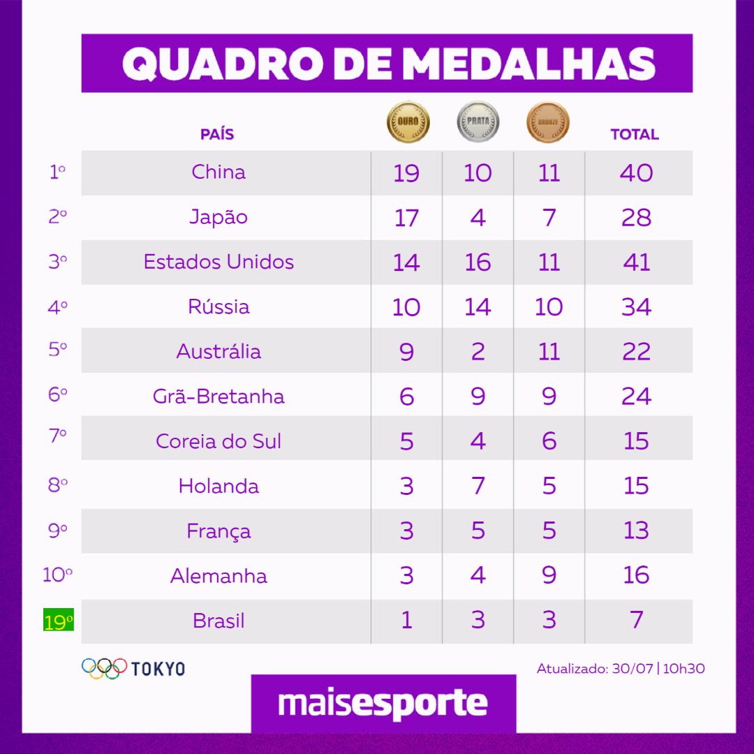 Confira o quadro de medalhas dos Jogos Olímpicos de Tóquio nesta sexta-feira 30/07 às 10h30