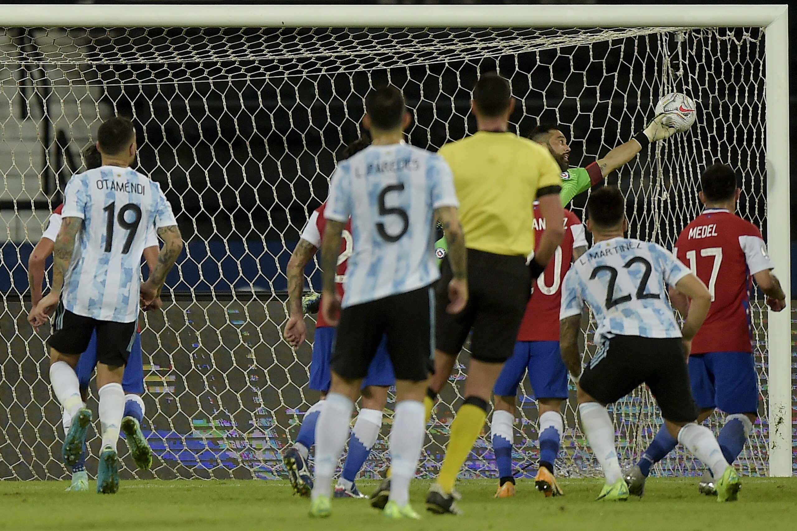 Vidal sofreu a falta dentro da área e ele mesmo cobrou a penalidade, confirmada pelo VAR. O goleiro Martínez pulou no canto certo e espalmou. A bola acertou o travessão e, no rebote, Vargas completou de cabeça para as redes. Os argentinos reclamaram de um suposto toque de mão na bola do chileno, mas Wilmar Roldan confirmou o gol de empate.