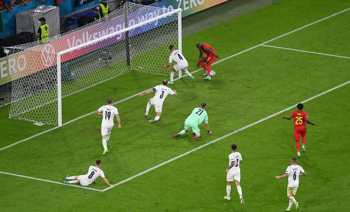 Bélgica e Itália fizeram o melhor primeiro tempo da competição europeia até o momento. Os belgas foram protagonistas no início, com boa atuação de De Bruyne e Lukaku, os craques da equipe. O meia do Manchester City parou em excelente defesa de Donnarumma com a mão direita aos 21. Aos 25, o atacante da Inter de Milão exigiu outra linda intervenção do arqueiro. Ele chutou cruzado, rasteiro, mas Donnarumma espalmou no canto direito.