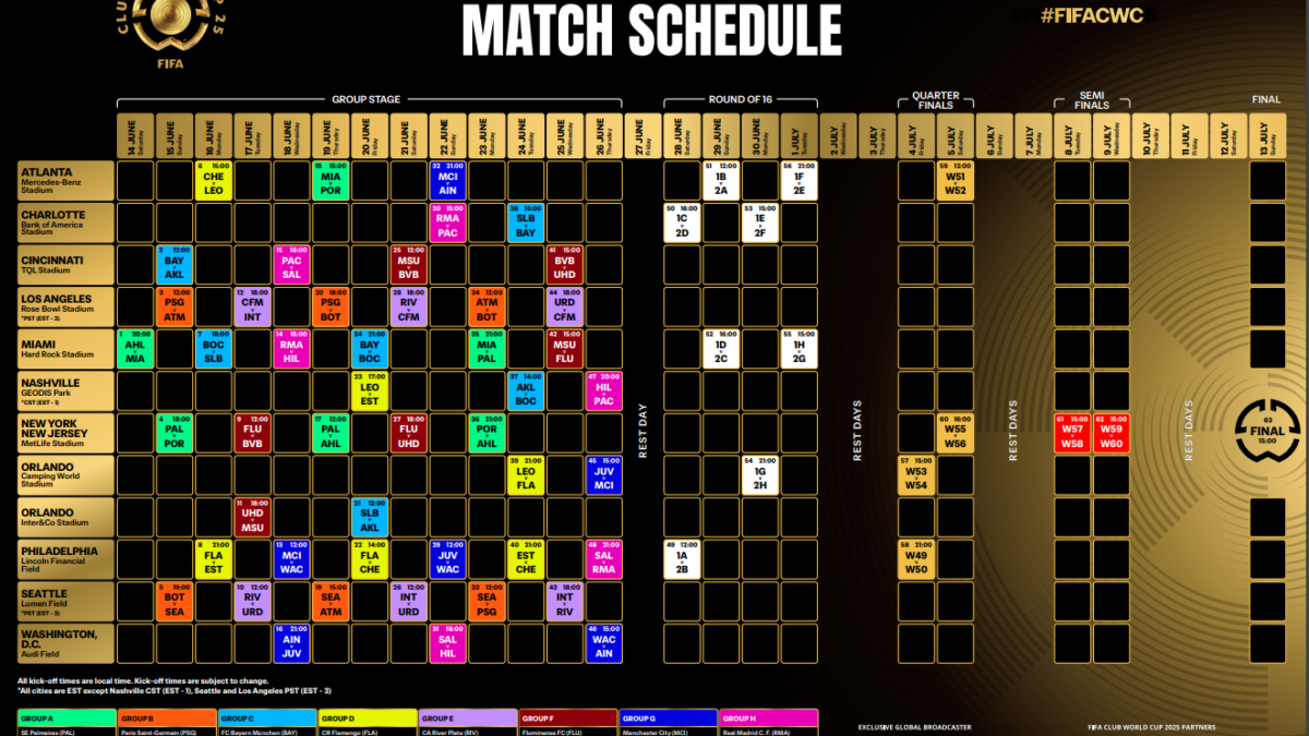 A FIFA divulgou a tabela completa dos jogos e horários do novo Mundial de Clubes. Estão previstos 63 jogos no calendário da competição que começa no dia 14 de junho de 2025 e termina no dia 13 de julho, nos EUA. O jogo de abertura do mundial de clubes será entre o Inter Miami, representando o país sede, contra o Al Ahly, e acontecerá no Hard Rock Stadium.