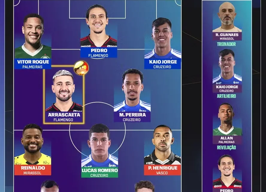 O Campeonato Brasileiro 2025 chegou ao fim e nesta segunda-feira (8/12) foi realizado o prêmio Melhores do Brasileirão, que é oferecido pelos canais ESPN. Na premiação, que ocorreu em São Paulo, foram escolhidos o craque e a seleção da competição, além de outros troféus individuais. O grande destaque foi para Arrascaeta, que foi campeão com o Flamengo. O meia rubro-negro foi escolhido o melhor jogador e ficou com a Bola de Ouro do torneio.