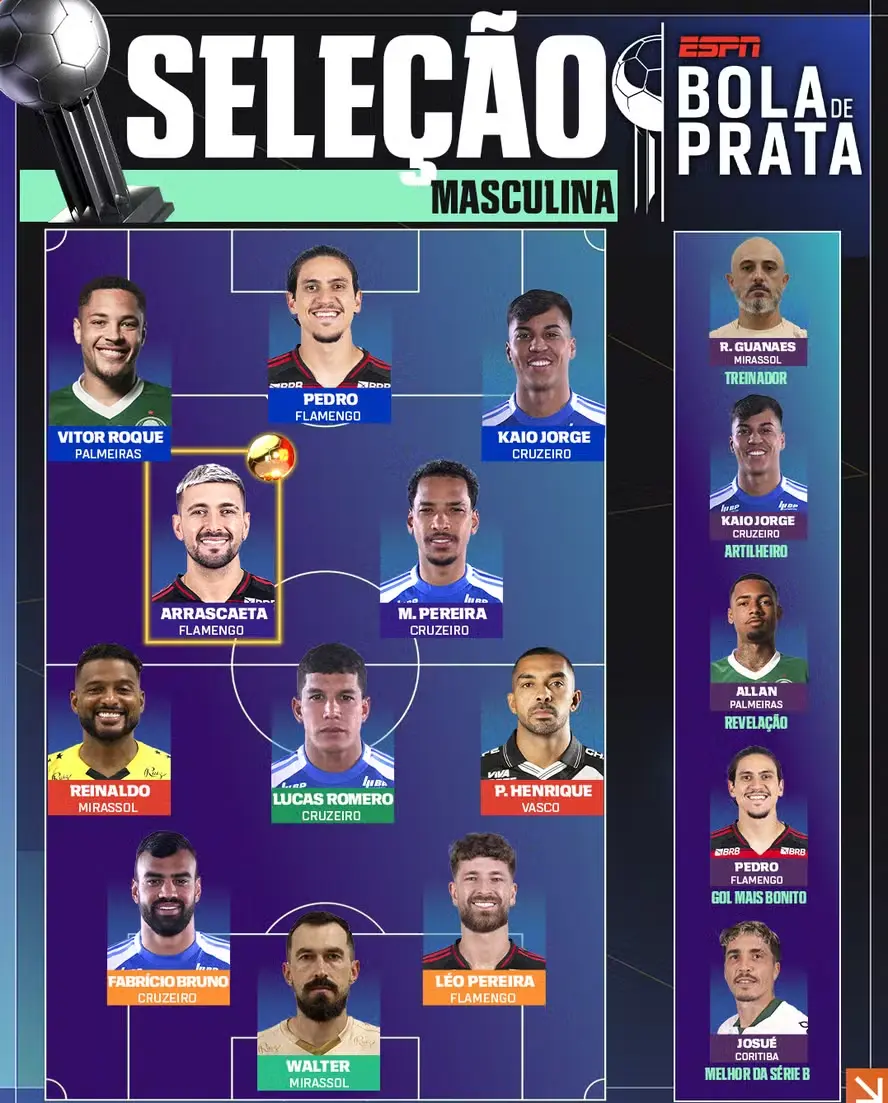 A seleção ficou da seguinte forma: Walter (Mirassol); Fabrício Bruno (Cruzeiro), Léo Pereira (Flamengo); Paulo Henrique (Vasco), Reinaldo (Mirassol); Lucas Romero (Cruzeiro); Arrascaeta (Flamengo), Matheus Pereira (Cruzeiro) ; Kaio Jorge (Cruzeiro), Pedro (Flamengo) e Vitor Roque (Palmeiras). Técnico: Rafael Guanaes (Mirassol).