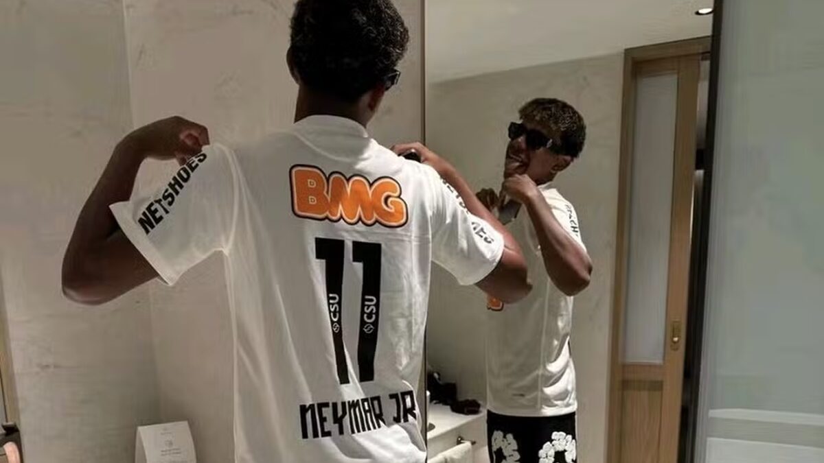 O jogador agora apareceu com uma camisa histórica do ídolo. Neymar vestiu a 11 do Santos por cinco temporadas, conquistando uma Copa do Brasil, uma Libertadores, uma Recopa e até o prêmio Puskás.
