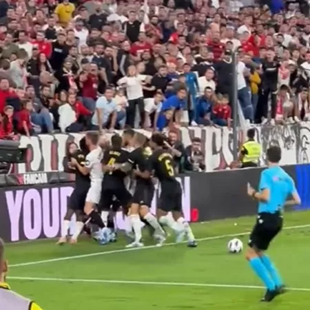 Os dois registros foram feitos durante uma confusão entre os jogadores [veja abaixo]. Tudo teve início quando o jogador brasileiro empurrou Nyland, do Sevilla, reclamando da cera dos rivais.