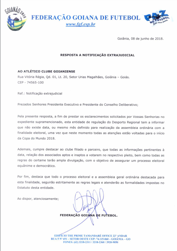 O Atlético Clube Goianiense, que integra a oposição à atual administração conduzida há nove anos por André Pita, solicitou, em 29/5, a lista dos votantes. No entanto, 10 dias depois, em 8/6, esta foi negada com a justificativa de que “neste momento todas as atenções estão voltadas para o início da Copa do Mundo”. Veja o documento na íntegra: