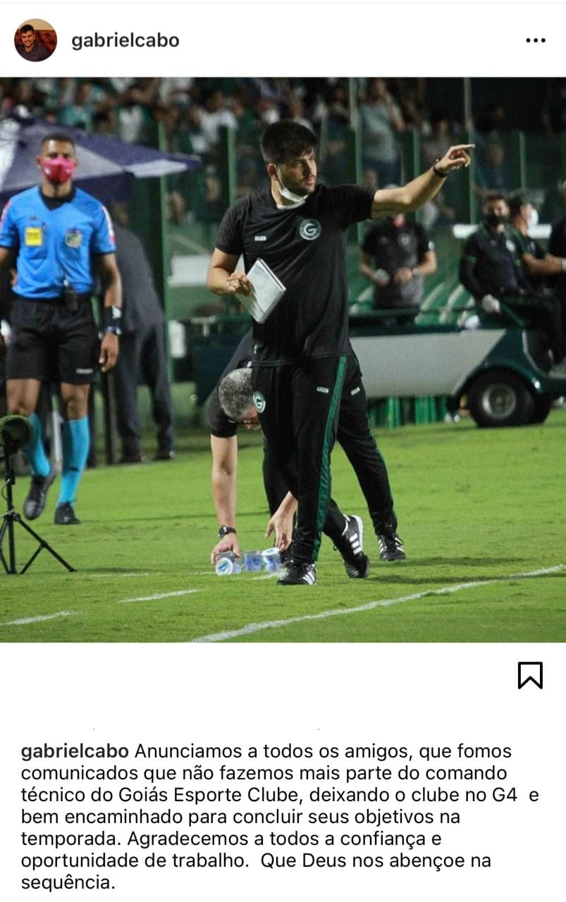 Gabriel Cabo, filho e auxiliar de Marcelo, disse que a comissão técnica foi informada que não faria mais parte do comando técnico do clube. Confira a publicação de Gabriel abaixo: