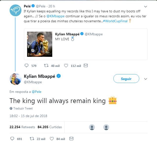 O atacante Kylian Mbappé respondeu mensagem de Pelé, que, depois de ver o jovem igualar mais um de seus recordes na final da Copa do Mundo de 2018 neste domingo (15), declarou que “teria que tirar a poeira das chuteiras”. “O rei sempre continuará sendo rei”, escreveu o francês, justamente na resposta à mensagem que o ex-camisa 10 brasileiro publicou em suas redes sociais à tarde.