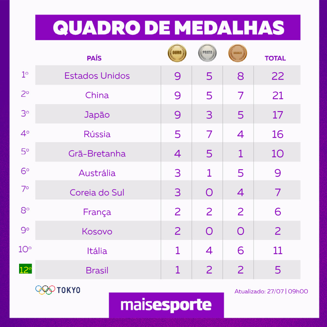 Confira o quadro de medalhas dos Jogos Olímpicos de Tóquio nesta terça-feira 27/07 às 09h00
