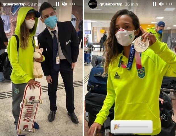 Rayssa obviamente usou seu skate para desfilar na área de desembarque do Aeroporto de Guarulhos em São Paulo, e na sequência deve embarcar com destino a Imperatriz no Maranhão, onde mora com sua família.