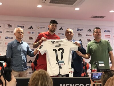Futebol Nacional Rossi é apresentado e fala em fazer história no Flamengo: ‘Espero ganhar muitos títulos’ Contratado com status de titular, Rossi mostra humildade no discurso e promete brigar nos treinos para convencer Jorge Sampaoli que pode herdar a vaga que foi de Santos e está com Matheus Cunha há 2 anos