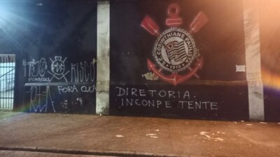 Torcedores do Corinthians picham muros do Parque São Jorge em protesto contra Cuca