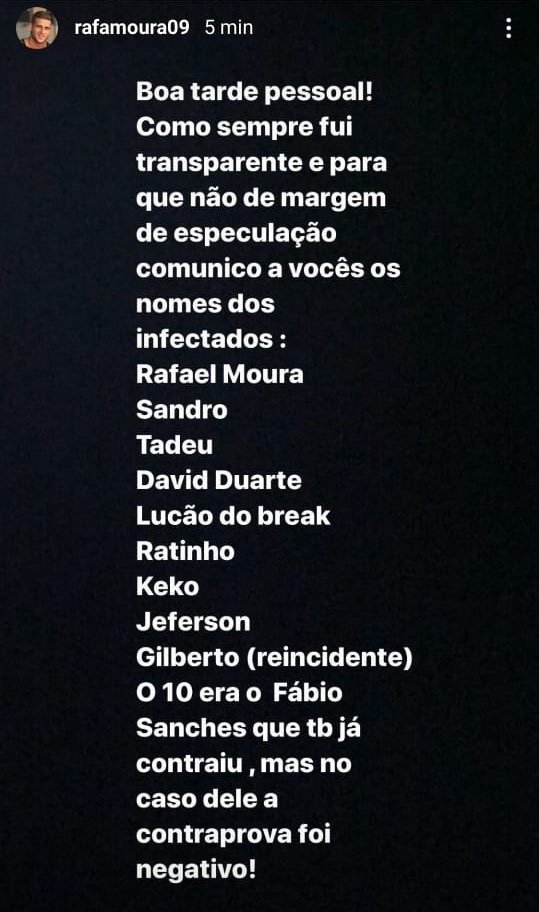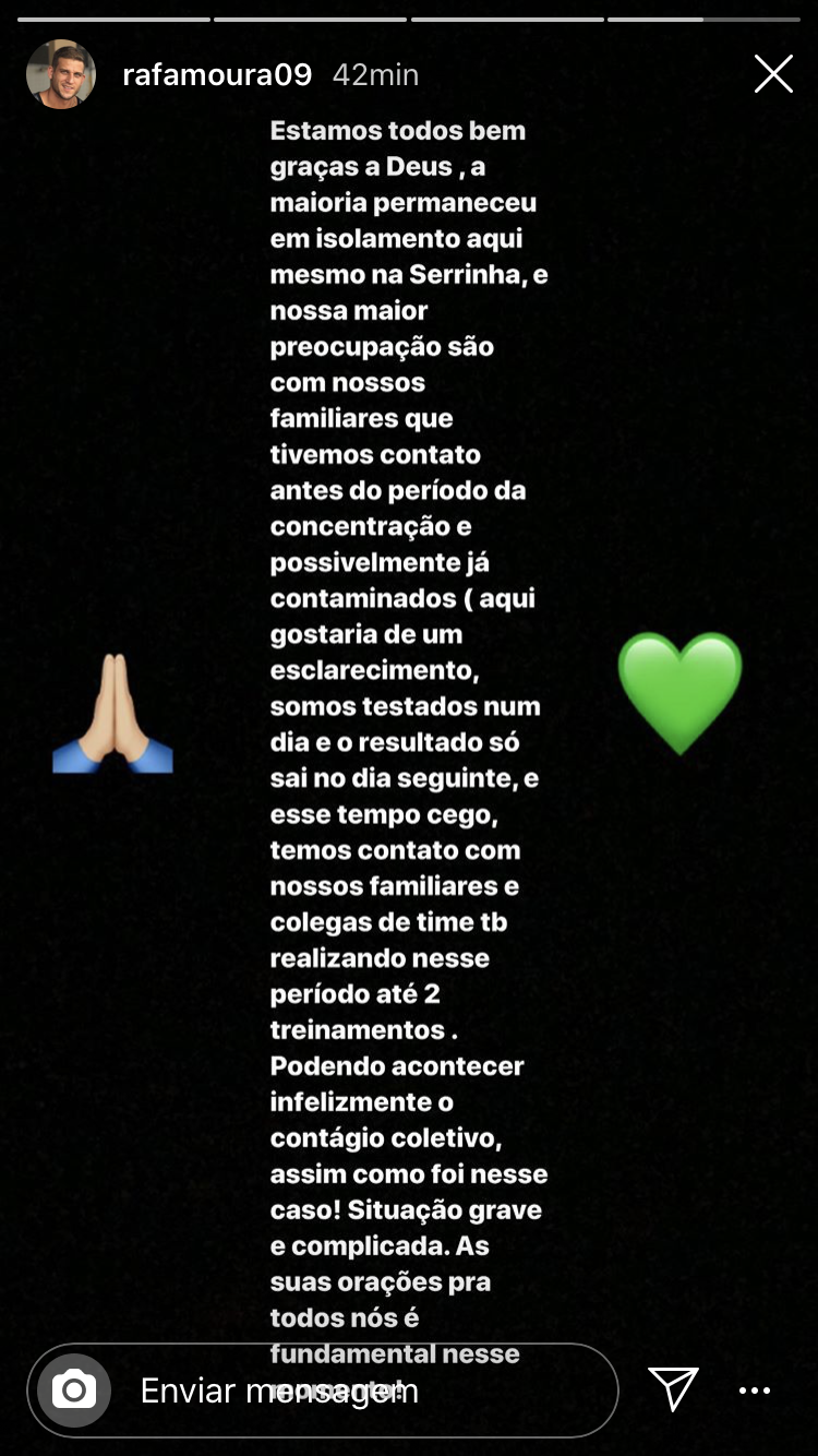 Rafael Moura também escreveu: “estamos todos bem, graças a Deus. A maioria permaneceu em isolamento aqui mesmo na Serrinha, e nossa maior preocupação é com os nossos familiares, com quem tivemos contato antes do período de concentração e que possivelmente foram contaminados”.