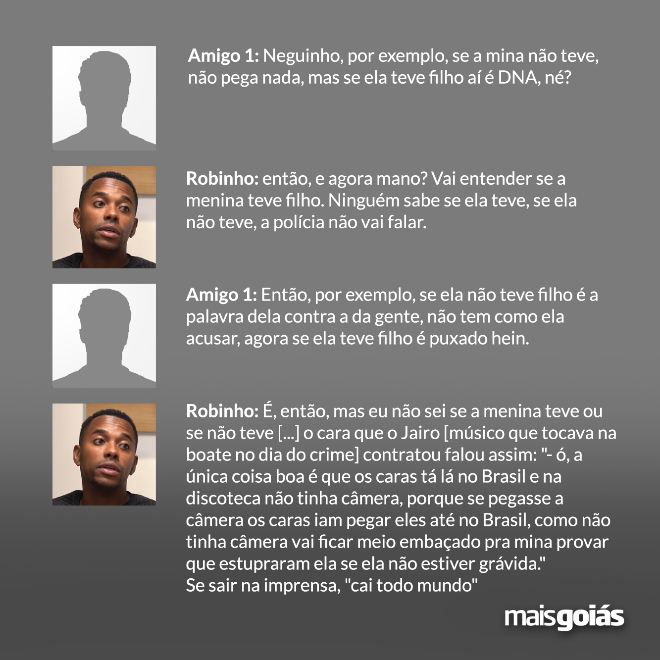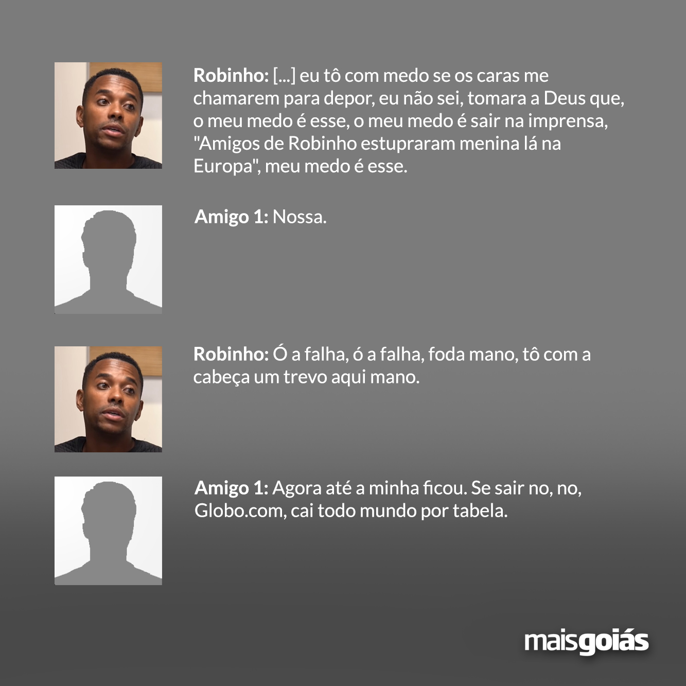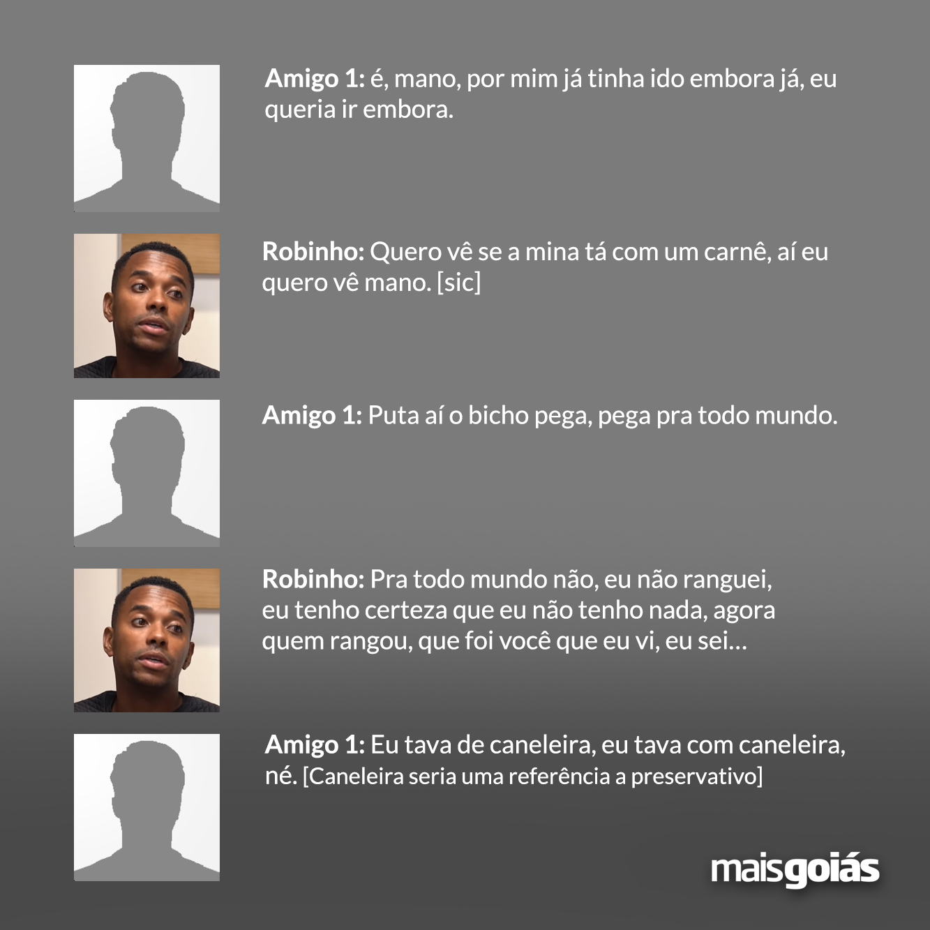 “Se os caras mandarem eu ir lá depor vai ser foda, vou falar o que pra minha nega? […] Vou lá depor pra quê? Oito cara rangaram a mina […]. Ó que fase que eu tô”, disse Robinho por telefone a um amigo, em transcrição anexada ao processo em 18 de novembro e obtida pelo UOL Esporte.