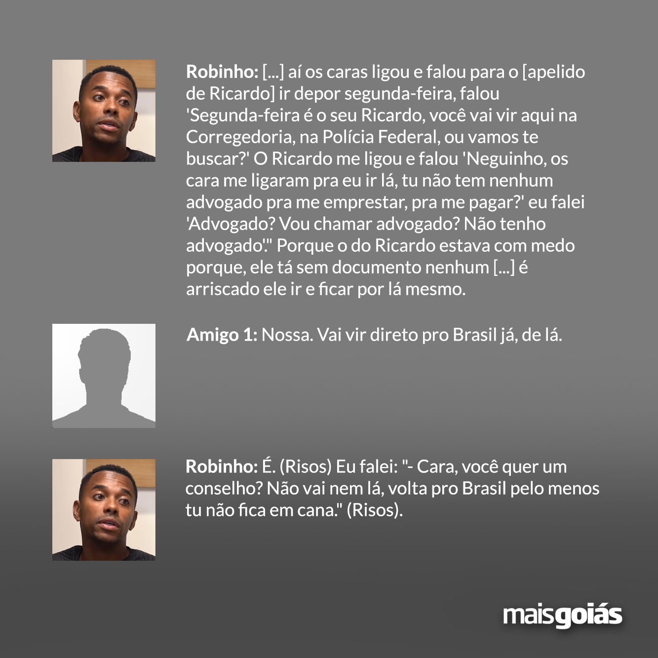 Mais tarde, ao relatar uma conversa com Ricardo Falco, que estava sendo convocado a depor à polícia, Robinho diz: “Cara, você quer um conselho? Não vai nem lá, volta pro Brasil, pelo menos tu não fica em cana.” (Risos).