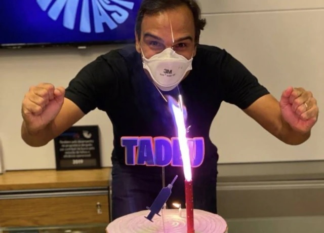 Tadeu Schmidt assoprou as velinhas de aniversário neste domingo, 18, nos bastidores do programa Fantástico, da TV Globo. O apresentador completou 47 anos e recebeu, da produção, um bolo com o tema ‘vacinação’ contra a covid-19.