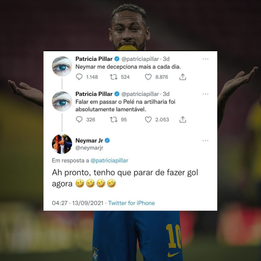 “Ah pronto, tenho que parar de fazer gol agora”, respondeu Neymar ao tuíte da atriz. O nome de Patricia Pillar ficou entre os assuntos mais comentados da rede social na manhã desta segunda.