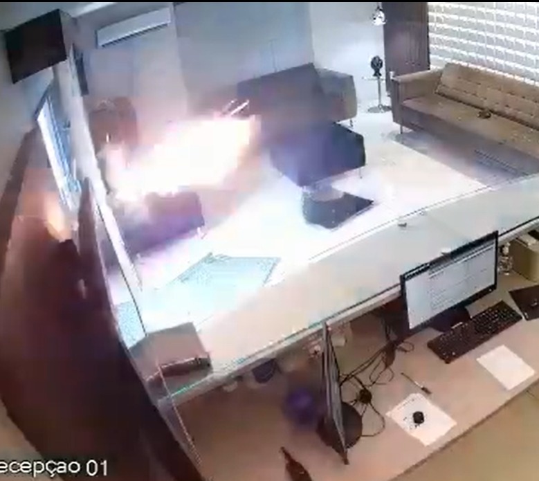 Nas imagens das câmeras de segurança é possível ver a reação de susto, das pessoas dentro do escritório atacado. Pedras, rojões e até um capacete foram utilizados pelos vândalos.