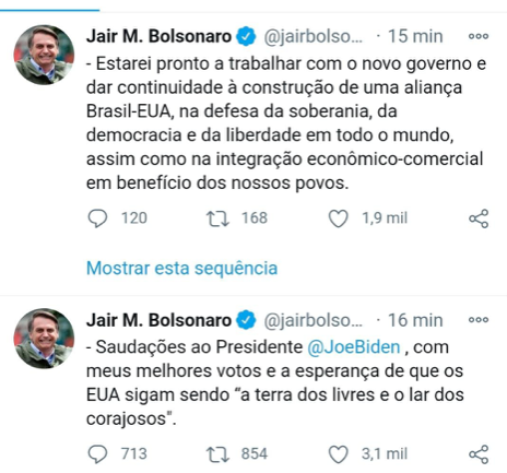 “Estarei pronto a trabalhar com V. Exa. e dar continuidade à construção de uma aliança Brasil-EUA, na defesa da soberania, da democracia e da liberdade em todo o mundo, assim como na integração econômico-comercial em benefício dos nossos povos”, conclui o comunicado.