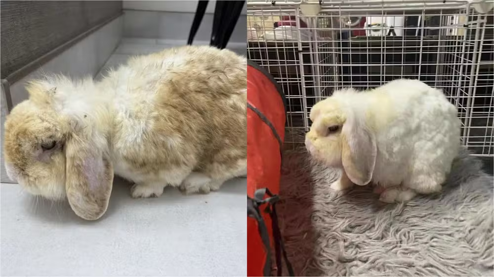 Coelho ‘marrom’ que vivia com fumantes toma banho e revela sua verdadeira cor; veja