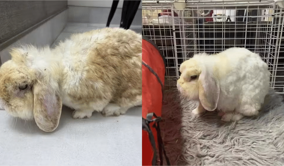 Coelho ‘marrom’ que vivia com fumantes toma banho e revela sua verdadeira cor; veja