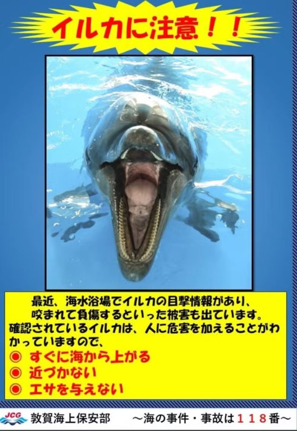 Placas de alerta foram colocadas ao longo da costa central japonesa, advertindo os turistas a sair da água se virem um golfinho — ou, para ser exato, Suzu — na região a nordeste de Kyoto.