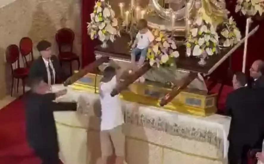 Um homem chamou a atenção das redes sociais após ter entrado em uma igreja e corrido pelo interior do local com uma criança sobre os ombros. A situação, porém, ficou ainda mais inusitada quando ele subiu ao altar e colocou o menino em cima da estátua de Nossa Senhora do Carmo. O episódio ocorreu no último domingo em Tenerife, na Espanha.
