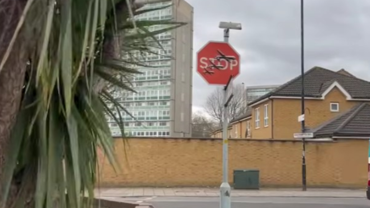 A peça, um sinal de pare vermelho com a imagem de três drones militares pintados, apareceu na esquina da rua Commercial Way, em Peckham, sudoeste da cidade inglesa, na manhã de sexta-feira. A obra tem sido interpretada como um apelo ao cessar-fogo na Faixa de Gaza.