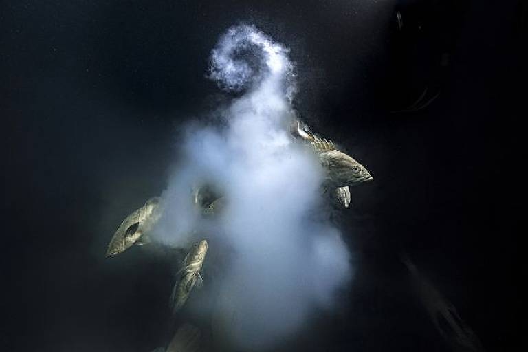 Imagem de vários peixes correndo para liberar seus espermatozoides enquanto uma fêmea solta uma explosão de óvulos vence concurso