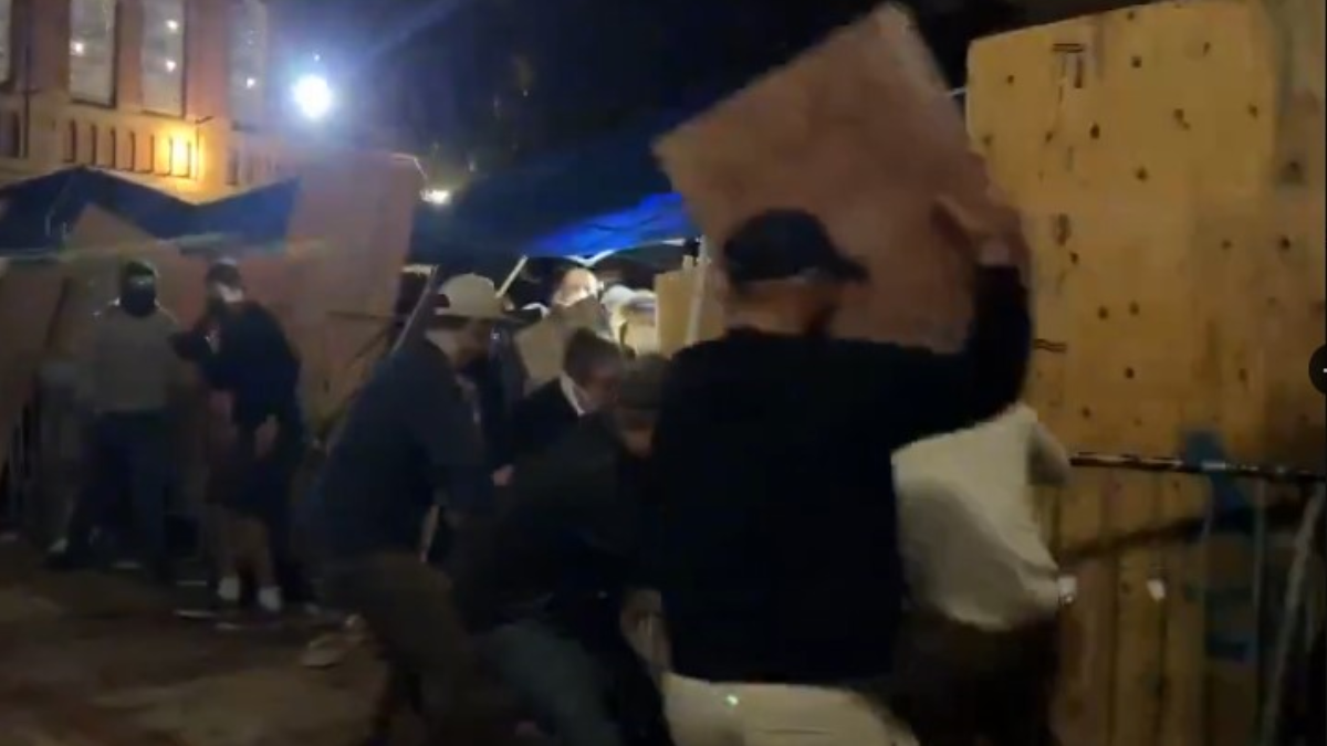 Em imagens transmitidas pela televisão, foi possível ver manifestantes se enfrentando com paus, enquanto outros lançavam fogos de artifício ou arremessavam objetos para o lado oposto. A emissora KABC, uma afiliada da ABC, também mostrou pessoas empunhando pedaços de pau para atacar placas de madeira que protegiam os manifestantes pró-Palestina, que seguravam cartazes ou guarda-chuvas.